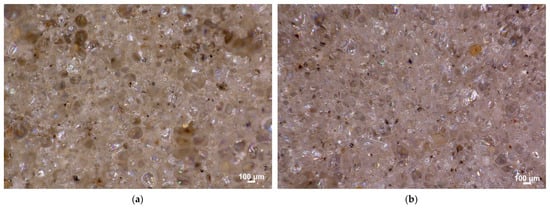 Optical micrographs of the 5M15FA polyurethane foam composite following accelerated aging in a laboratory dryer (a) and exposure to ambient conditions (b). The samples were examined at a magnification of 100×.