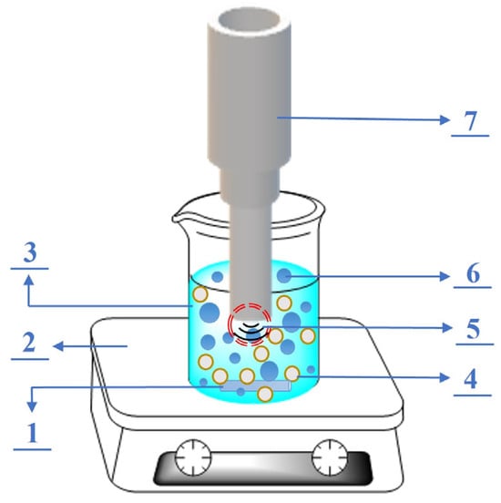 Ultrasound-assisted preparation process: 1—magnetic rotor, 2—magnetic agitator, 3—nitric acid solution, 4—PS[C4mim][Cl], 5—ultrasound cavitation phenomenon, 6—cavitation bubbles, 7—ultrasonic probe.