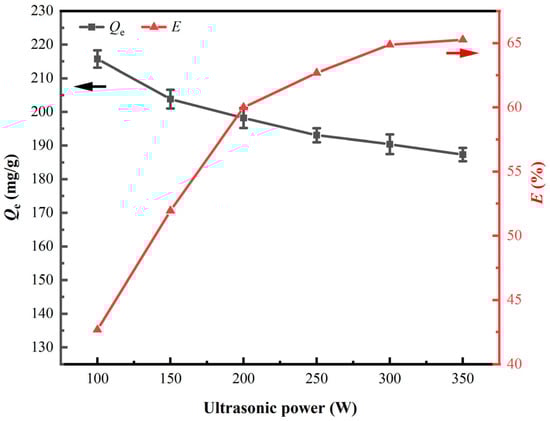 The amount of substance of HNO3 is 1.6 times that of the theoretical value (NHNO3 = 1.6), and reaction time is 15 min. The impacts of ultrasound power on the synthesis of CSILs and vanadium (V) adsorption capacity onto them were investigated under 100 W to 300 W. Corresponding results are displayed in Figure 3.