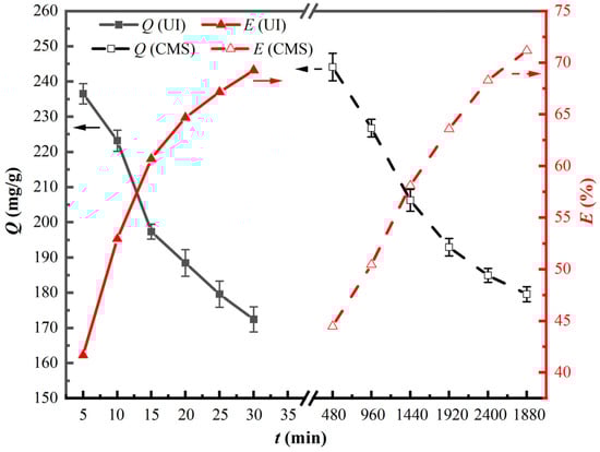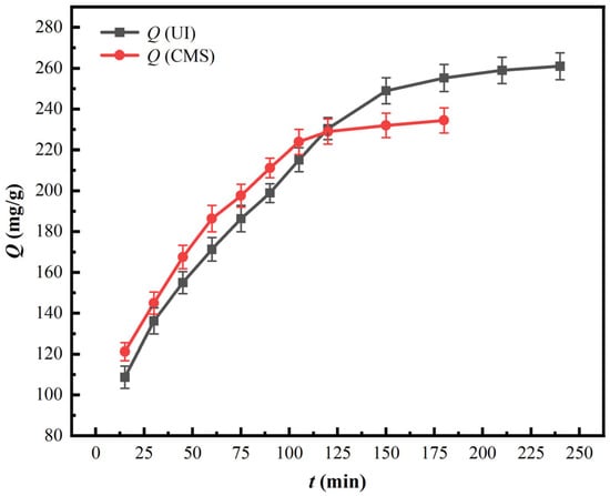 As is presented in Figure 6, vanadium (V) adsorption capacity onto UI-CSILs and CMS-CSILs both first rapidly augment with the extension of contact time, and then the growth trend slows to equilibrium. Vanadium (V) adsorption capacity onto CMS-CSILs attains equilibrium at 105 min as 223.90 mg/g, while the adsorption capacity of UI-CSILs continuously elevates after 105 min and finally achieves equilibrium at 150 min as 248.95 mg/g. Nevertheless, vanadium (V) adsorption capacity onto the former is always slightly higher than that onto the latter before 120 min, which is ascribed to the disparate existence forms of ILs on the resins. Commonly, metal ions adsorption on adsorbents consists of three steps: (1) diffusion of metal ions through the liquid films on the resin surface; (2) intraparticle diffusion of metal ions in the resin pores; and (3) the reaction between metal ions and the functional groups. Generally, the intra-particle diffusion process is accepted as the rate-controlling step [38]. As is stated in Section 3.1.1, the ILs loaded on UI-CSILs enter the deeper pore channels compared to that on CMS-CSILs. Hence, it takes more time for vanadium ions to diffuse into the deep pore channels of the resin and react with the loaded ILs, resulting in the longer adsorption equilibrium time of UI-CSILs. In contrast, as the reaction time extends to longer than 120 min, vanadium (V) adsorption capacity onto UI-CSILs is apparently higher than that of CMS-CSILs, ascribed to the fact that the ILs in deeper pores can finally react with the vanadium ions.