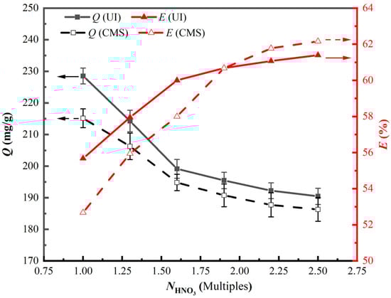 When NHNO3 is higher than 1.9, it is distinct that the ion exchange ratios of UI-CSILs are always lower than that of CMS-CSILs. It is speculated that ultrasonic cavitation would induce a break of chemical bonds between the ILs and the resins’ pore surface, leading to the desorption of some ILs loosely loaded on the resins [37]. The vanadium (V) adsorption capacities onto UI-CSILs and CMS-CSILs- both follow the principle that the larger the proportion of NO3− within the ILs is, the lower the adsorption capacity towards vanadium (V). Therefore, the optimal amount of HNO3 is selected as NHNO3 of 1.6 and 1.9 for UI-CSILs and CMS-CSILs, respectively.