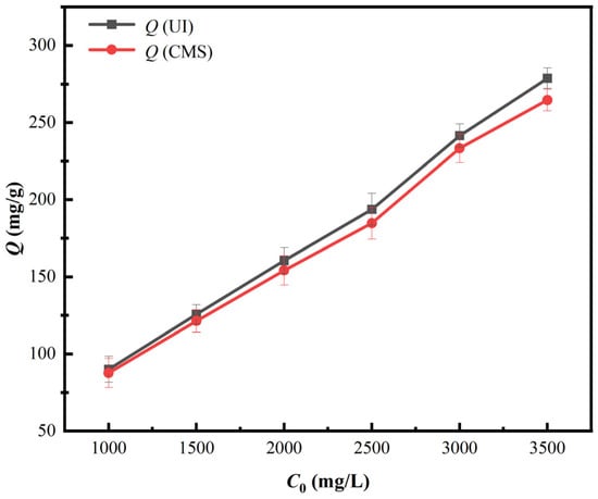 To investigate the impacts of initial vanadium (V) concentration over the adsorption properties of PS[C4mim][NO3], corresponding experiments were conducted under initial pH value of 1.6, contact time of 150 min for UI-CSILs (105 min for CMS-CSILs), and adsorption temperature of 25 °C. Corresponding results are displayed in Figure 7.