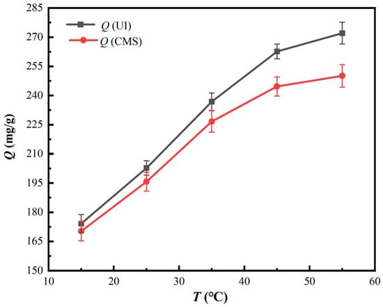 To probe the impacts of adsorption temperature on vanadium (V) adsorption capacity onto PS[C4mim][NO3], corresponding experiments were conducted under initial pH value of 1.6, contact time of 150 min for UI-CSILs (105 min for CMS-CSILs) and initial vanadium concentration of 2500 mg/L. The results are displayed in Figure 8.