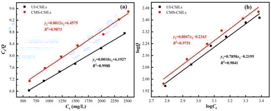 The Langmuir (Equation (5)) and Freundlich (Equation (6)) isotherm models are usually adopted to describe the adsorption equilibrium in liquid–solid systems [39]. The Langmuir model generally assumes that the adsorption reaction of metal ions takes place on a homogeneous surface as a single molecular layer, in which there is no interaction among the adsorbed ions. The Freundlich model hypothesizes that the adsorption reaction of metal ions takes place on a heterogeneous surface as multimolecular layers. The Langmuir and Freundlich models were adopted to analyze the adsorption experimental data of UI-CSILs and CMS-CSILs in Figure 6, and corresponding fitting results and relevant fitting parameters are displayed in Figure 9 and Table 2, respectively.
