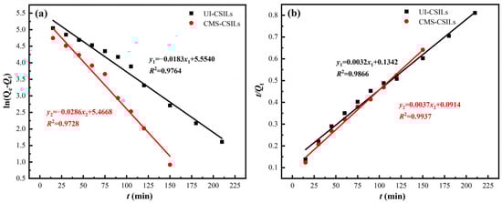 The adsorption kinetics reflects the adsorption process of metal ions by the adsorbents, which is significant for the evaluation of the rate-controlling step during the entire adsorption process. The experimental data in Figure 7 were depicted with the pseudo-first-order kinetic model [40] (Equation (7)) and the pseudo-second-order kinetic model [41] (Equation (8)) to investigate the adsorption mechanism of vanadium (V) on UI-CSILs and CMS-CSILs. Corresponding fitting results are displayed in Figure 10, and relevant fitting parameters are exhibited in Table 3.