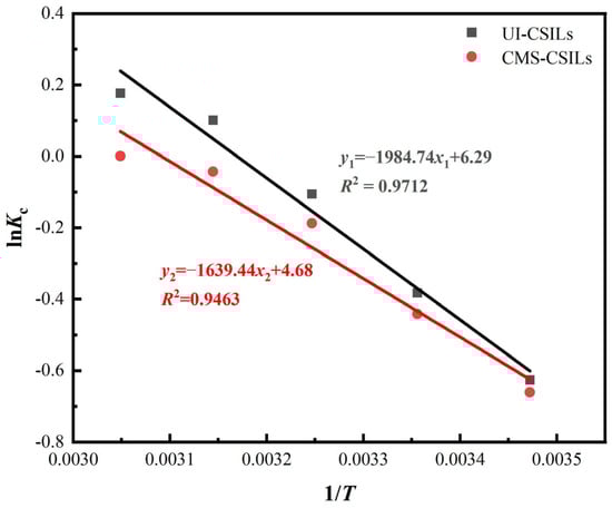 The adsorption temperature has a great influence on the adsorption properties of PS[C4mim][NO3]l; hence, the exploration of adsorption thermodynamics is vital for the revelation of the adsorption mechanism of vanadium (V) onto CSILs. According to the experimental data in Figure 8, the adsorption thermodynamic process of vanadium (V) is depicted by Equations (9) and (10) with lnkc against 1/T. The enthalpy change and entropy change are calculated according to Equation (10) based on the slope and intercept in Figure 11. In addition, Gibbs free energy change is computed by Equation (11).