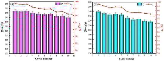 Ten cyclic adsorption–desorption experiments were carried out to evaluate the adsorption stability of UI-CSILs and CMS-CSILs. The adsorbed CSILs and 5 mol/L HNO3 solution were mixed at L/S of 400:1 mL/g in a conical flask and oscillated in a thermostatic bath oscillator for 5 h to finish the desorption process. The desorption ratio (DV) of vanadium (V) and the maintained ratio (ηn,%) of vanadium (V) adsorption capacity at the nth cycle compared to the initial vanadium (V) adsorption capacity were calculated based on Equations (3) and (4), respectively. The desorption ratio of vanadium (V) from these two CSILs was kept higher than 97% each time.