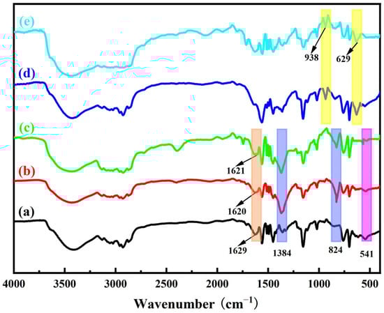 As is presented in Figure 13, the peak located at 541 cm−1 in Figure 13a is assigned to [Cl]−, which weakens but does not disappear in Figure 13b,c. This implies that most of the [Cl]− is exchanged during the grafting reaction process, but some remains unexchanged. The peaks at 824 cm−1 and 1384 cm−1 in Figure 13b,c are the symmetric and antisymmetric vibrational absorption peaks of [NO3]−, further indicating that [Cl]− is successfully replaced by [NO3]− by ion exchange. The alkyl absorption peak of 1629 cm−1 on PS[C4mim][Cl] shifts to 1621 cm−1 and 1620 cm−1 on PS[C4mim][NO3], which is ascribed to the interaction of the ILs cation and [NO3]−. The aforementioned results prove that both UI and CMS can successfully synthesize PS[C4mim][NO3] by chemical grafting processes. In Figure 13d,e, the peaks at 938 cm−1 and 629 cm−1 are assigned to the stretching vibration V=O and V-O bond [46,47], respectively, which indicates that vanadium (V) has already been adsorbed on PS[C4mim][NO3]. Particularly, the intensity of V=O and V-O bond on UI-CSILs is obviously higher than that on CMS-CSILs-, proving relative higher adsorption capacity of the former towards vanadium (V).