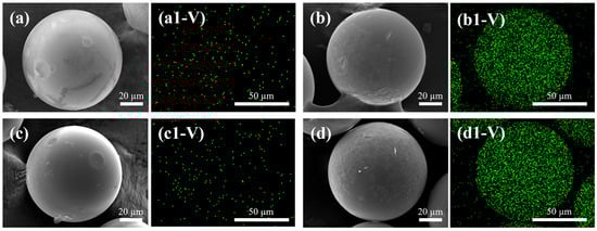 As is presented in Figure 14a,c, both UI-CSILs and CMS-CSILs maintain an intact spherical structure, which demonstrates that the introduction of ultrasound waves will not destroy the skeleton of the resin particles. In Figure 14(b1,d1), it is visibly observed that vanadium (V) uniformly distributes on the surface of UI-CSILs and CMS-CSILs after adsorption, proving the high affinity of such-prepared adsorbents towards vanadium (V).