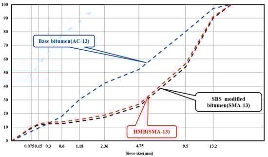 Limestone (0~3 mm, 3~5 mm) and basalt (5~10 mm, 10~15 mm) were adopted as aggregates in this study. To simulate the practical application, the gradations for three kinds of bitumen were selected as AC-13 (for base bitumen) and SMA-13 (for SBS-modified bitumen and HMB). The gradation curves of these three mixtures are shown in Figure 1. The bitumen mixtures were designed via the Marshall design method. It was calculated that the asphalt content was 4.5% for the base bitumen mixture and 6.5% for the SBS-modified bitumen and HMB mixtures. In addition, to mimic the mixing process of bitumen mixtures on site, the mixing temperatures of base bitumen, SBS-modified bitumen, and HMB mixtures were set to 165 °C, 175 °C, and 185 °C, respectively.