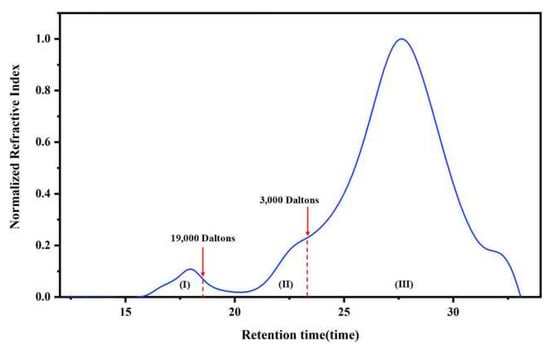 Waters 1515 Isocratic high-performance liquid chromatography was adopted to analyze the molecular weight and molecular weight distribution of the bitumen sample under different ageing conditions. And tetrahydrofuran (THF) was adopted as the mobile phase. During the test, the sample slowly flowed into the column with some porous gel at 1 mL/min under the action of the mobile phase. The smaller the size of the molecules in the sample, the easier it was to spread them into the pores of the gel column, while the larger molecules could pass straight across. As such, small molecules took longer to pass through the gel column than large molecules in the GPC test. A refractive index detector detected the difference in refractive index from the reference flow path towards the sample, and the included computer software recorded the retention time and refractive index data of the measured sample. Figure 3 presents a typical chromatogram of a representative bitumen in the GPC test. By establishing the calibration curve, the sample’s retention time was transformed into the molecular weight of the sample.