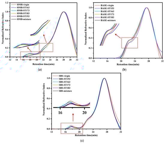 GPC chromatogram of the bitumen and bitumen mixture samples: (a) HMB; (b) base bitumen; (c) SBS-modified bitumen.