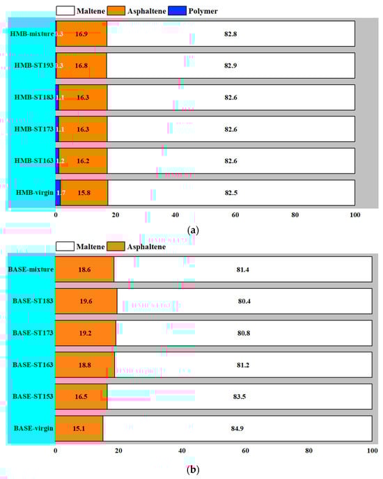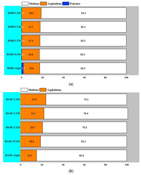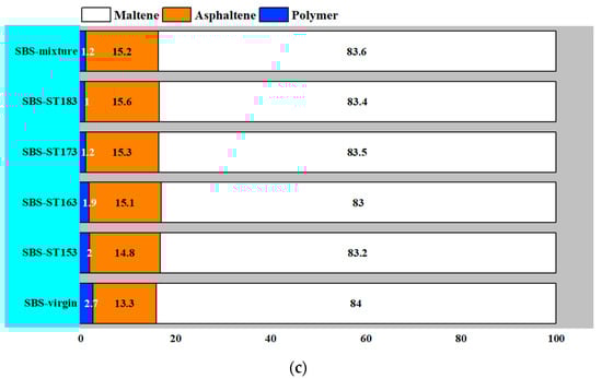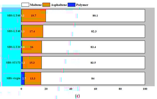 Based on the collected chromatograms, the polymer, asphaltene, and maltene contents of the samples were quantified, and the results are presented in Figure 5.