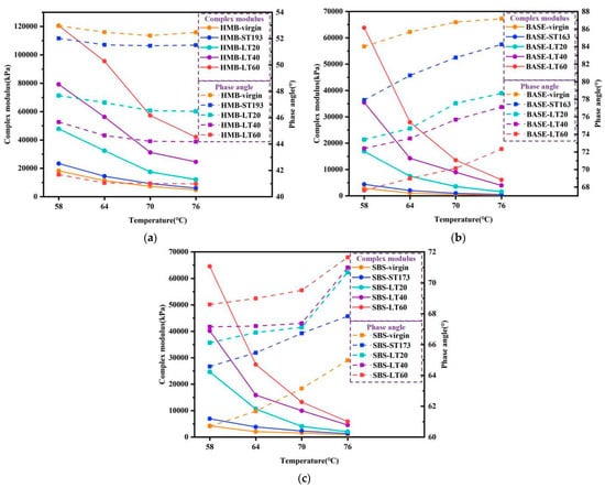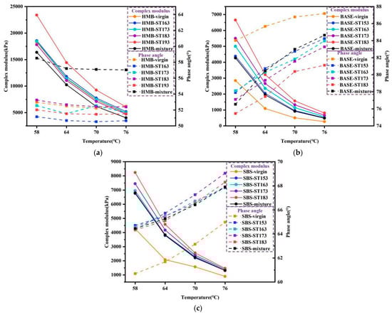 The TS test was performed in DSR at 58 °C, 64 °C, 70 °C, and 76 °C to measure the complex modulus (G*) and phase angle (δ) of the prepared bitumen samples. During the TS test, a sinusoidal oscillatory load with a frequency of 10 rad/s was applied in a controlled strain mode, and the strain levels were all set to 10%. Three parallel tests were conducted for each set of samples.