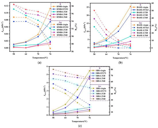 R3.2 and Jnr3.2 of bitumen: (a) HMB; (b) base bitumen; (c) SBS-modified bitumen.