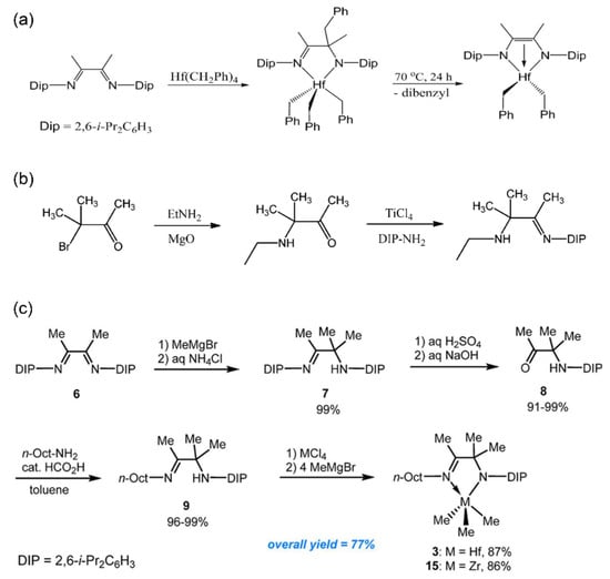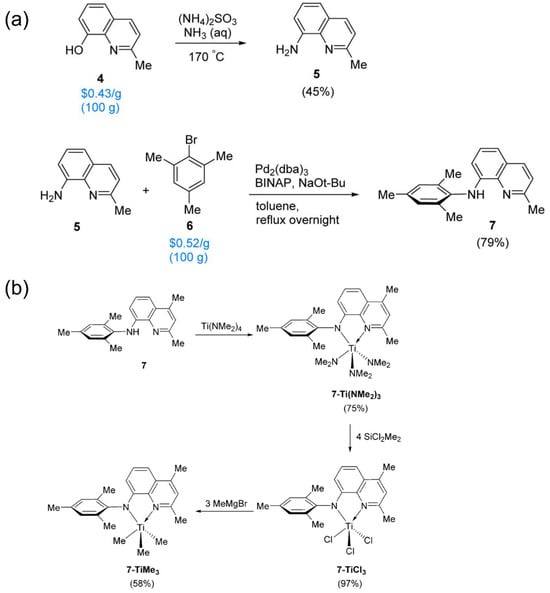 Building on the above successful discovery, Fontaine et al. further optimized the synthesis route of the quinoline-amino Hf complexes to facilitate the real applications [67]. They developed a high-efficiency method to avoid the use of expensive starting material, in which readily available 8-hydroxyquinoline was converted into 8-aminoquinoline, then coupled with 2-bromomesitylene (Figure 6a). And the corresponding Zr and Hf methyl derivatives were successfully synthesized using the same methylation method. For Ti methyl derivatives, the authors also provided an alternative synthetic route (Figure 6b), since TiCl4 was sensitive to active hydrogens. By copolymerization experiments of ethylene/1-octene POEs at 140 °C, the Hf complexes were determined to be superior.