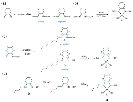 Synthesis routes of (a) the imino-enamines ligand, (b) Hf complex, (c) asymmetric type Hf complex, (d) asymmetric type complex [61]. Reprinted with permission of American chemical society publication, copyright (2025).