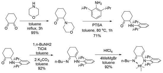 Synthesis route of the imino-enamine Hf complex for scale-up production [62]. Reprinted with permission of American chemical society publication, copyright (2025).