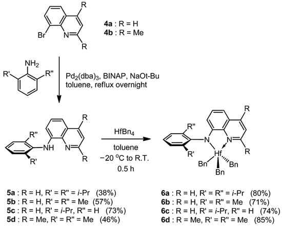 - Kwon, S.J.; Baek, J.W.; Lee, H.J.; Kim, T.J.; Ryu, J.Y.; Lee, J.; Shin, E.J.; Lee, K.S.; Lee, B.Y. Preparation of Pincer Hafnium Complexes for Olefin Polymerization. Molecules 2019, 24, 1676. [Google Scholar] [CrossRef] [PubMed]