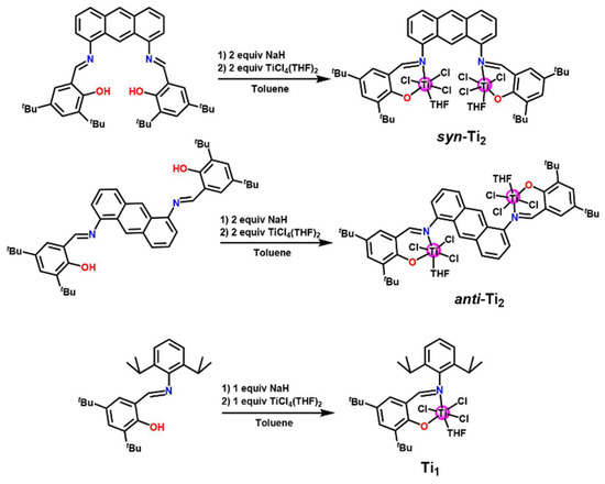 Synthesis route of the anthracene bridged phenoxy-imine Ti catalyst [78]. Reprinted with permission of American chemical society publication, copyright (2025).