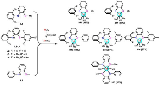 Synthesis routes of the amido-quinoline Hf complexes [65]. Reprinted with permission of American chemical society publication, copyright (2025).