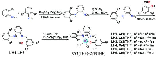 Tian et al. synthesized phenoxyimine-amino tridentate ligands by cross-coupling, reduction, and condensation reactions, using 1-bromo-2-nitrobenzene as the starting material [85]. The corresponding aniline and salicylaldehyde derivations were subsequently coordinated with CrCl3(THF)3 to yield phenoxyimine-amino Cr complexes with high yields (Figure 12). By ethylene homopolymerization experiments, these complexes were found to be effectively activated with a slight cocatalyst MAO (Al/Cr = 200), achieving a high catalytic activity of 1.18 × 108 g(PE)·mol−1·h−1 at 80 °C and retaining a moderate activity of 6.75 × 107 g(PE)·mol−1·h−1 at 120 °C.