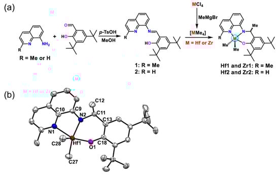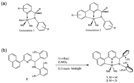 (a) Simplified synthesis route of the amido-quinoline complex (the star represents methyl transfer position); (b) crystal structure of the Hf catalyst [69]. Reprinted with permission of American chemical society publication, copyright (2025).