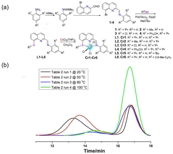 (a) Synthesis routes of the quinoline-imine-thioether Cr complexes; (b) GPC traces of polyethylenes obtained with Cr1 at different temperatures [89]. Reprinted with permission of American chemical society publication, copyright (2025).