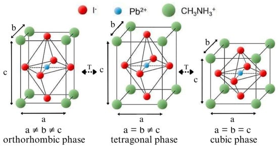 Zawadzka et al., Li et al., and Zhang et al. in their works claim that perovskite materials can occur in three crystallographic phases: cubic, tetragonal, and orthorhombic [,,] (Figure 1). The ability to change the phase is possible by changing the temperature of the material, and each phase change affects its optical parameters. According to researchers, perovskite assumes the tetragonal phase at room temperature. At temperatures higher than room temperature, it occurs in the cubic and orthorhombic phases at lower temperatures. Phase transition temperatures are conventional for the group of perovskite materials. There are various types of perovskites that can be obtained by chemical synthesis, which allows for tuning their physicochemical properties. Therefore, the temperatures corresponding to phase transitions can also be different. According to sources provided by Brittman et al., MEAPbI3 assumes the tetragonal phase at room temperature, the transition to the cubic phase is observed at 330–350 K, and the transition to the orthorhombic phase is observed at about 140–160 K [].
