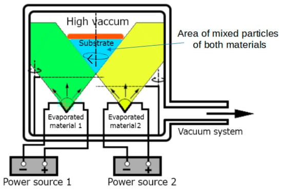 The thin layers described in the paper were created using the Thin Film Deposition System—NANO 36™ (Kurt J. Lesker Company, Jefferson Hills, PA, USA), equipped with two independently working thermal sources. The apparatus diagram is shown in Figure 3. This work used quartz glass substrates (BK7) with surfaces of about 4 cm2. The entire process of thin layer deposition takes place in a tightly closed vacuum chamber under high-vacuum conditions of the order of 10−5 Tr. To obtain the tested thin films of hybrid perovskites, we used methylammonium iodide (organic part) and lead (II) iodide (inorganic part), the melting points of which are different. It is about 280 °C for methylammonium iodide, and, for lead (II) iodide, it is about 400 °C. The shutters and piezoelectric thickness sensors placed inside the chamber and the possibility of controlling the conditions of pressure, temperature, and evaporation rate of materials allow for the precise control of the deposition process and the creation of the desired thin film structure of a specific thickness and composition.