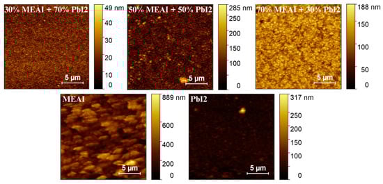AFM images of MEAPbI3 perovskite thin films of three different compositions and MEAI and PbI2 thin films.
