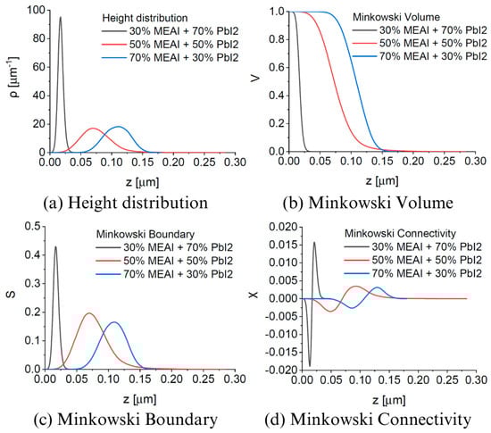 Parameters of MEAPbI3 perovskite thin films for different compositions determined based on AFM measurements: (a) height distribution; (b) Minkowski Volume; (c) Minkowski Boundary; (d) Minkowski Connectivity.
