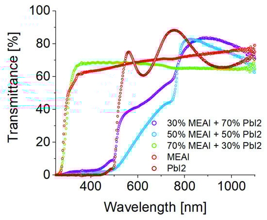 Figure 7 shows the optical transmission spectra of thin perovskite films of three different compositions and, additionally, the transmission spectra of thin MEAI and PbI2 films, which are included in the graph for comparison purposes. Perovskite structures were made using the PVco-D technique. MEAI and PbI2 structures were made using the PVD technique. All thin films were deposited on a transparent glass substrate. The obtained experimental transmission spectra of perovskite films with the composition of 30% MEAI + 70% PbI2 and 50% MEAI + 50% PbI2 can be divided into a region of strong absorption (range 250–740 nm) and weak absorption (range 740–1100 nm). This research result is consistent with the result obtained for perovskite crystals based on iodides provided by Green et al. []. Comparing both compositions, the second one is characterized by stronger absorption. The transmission spectrum of the perovskite with the composition of 70% MEAI + 30% PbI2 looks completely different. It is evenly flattened in the tested wavelength range, and the transmission level reaches almost 70% and slightly decreases with increasing wavelength.