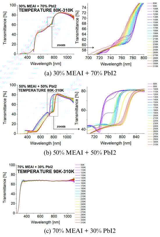 Temperature dependence of the transmission spectra of MEAPbI3 perovskite thin films of three different compositions produced by the PVco-D technique, deposited on a glass substrate: (a) 30% MEAI + 70% PbI2; (b) 50% MEAI + 50% PbI2; (c) 70% MEAI + 30% PbI2.