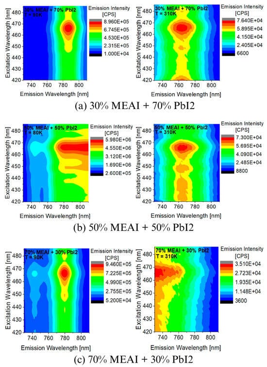Experimental 3D photoluminescence spectra of MEAPbI3 perovskite thin films with different compositions recorded for temperatures of 80 K and 90 K and for a temperature of 310 K: (a) 30% MEAI + 70% PbI2; (b) 50% MEAI + 50% PbI2; (c) 70% MEAI + 30% PbI2. The excitation wavelength was λexc = 420 nm.