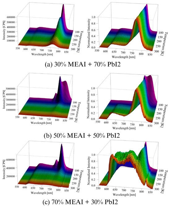 Experimental photoluminescence spectra of MEAPbI3 perovskite thin films with different compositions as a function of temperature: (a) 30% MEAI + 70% PbI2; (b) 50% MEAI + 50% PbI2; (c) 70% MEAI + 30% PbI2. The figure shows the spectra obtained directly from the measurement and the normalized spectra. The excitation wavelength was λexc = 420 nm.