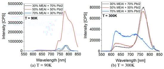 Comparison of photoluminescence spectra for different temperatures for MEAPbI3: (a) T = 90 K; (b) T = 300 K.
