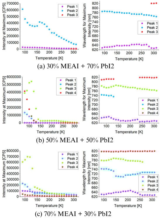 Dependence of the maximum intensity of peaks occurring in the photoluminescence spectra and the position of these peaks as a function of temperature for three different MEAPbI3 perovskite compositions: (a) 30% MEAI + 70% PbI2; (b) 50% MEAI + 50% PbI2; (c) 70% MEAI + 30% PbI2.