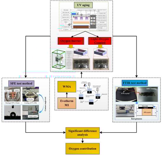 In this research, a monolithic UV aging and light–oxygen coupling device was developed, and a UV aging test method was established. The adhesive properties and functional group changes in WMA under oxygen barrier and photo-oxygen coupling conditions were analyzed using surface free energy and infrared spectroscopy. The relationship between different indexes was established, and the differences between oxygen barrier and light–oxygen-coupled UV aging were comparatively analyzed. Based on the results discussed above, the following conclusions can be summarized: