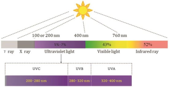 Solar radiation is a very important factor causing road damage. The solar spectrum can be divided into ultraviolet (100–380 nm), visible (380–780 nm), near-infrared (780–2500 nm) and far-infrared (2500–60,000 nm) by wavelength. Among them, the wavelength of 100–280 nm is ultraviolet (UVC), the wavelength of 280–320 nm is ultraviolet (UVB), and the wavelength of 320–380 nm is ultraviolet (UVA) (see Figure 4). The ultraviolet radiation with a wavelength of 100–280 nanometers is the shortest and belongs to strong waves. Due to the strong absorption of ozone, ultraviolet radiation cannot reach the ground and will not cause damage to asphalt pavement. Ultraviolet rays with wavelengths ranging from 280 to 320 nanometers belong to the medium wave category and have strong effects. Most of them are absorbed by ozone, and the number of ultraviolet rays reaching the ground is relatively small. In the solar spectrum, ultraviolet energy with wavelengths of 320–380 nanometers is the highest and cannot be fully absorbed by ozone. Ultraviolet radiation ranging from 280 nanometers to 380 nanometers can damage the molecular structure of asphalt materials, leading to a decrease in the performance of asphalt pavement [,]. Therefore, it is necessary to choose a UV light source with a wavelength of 280~380 nm to simulate UV aging under natural conditions.