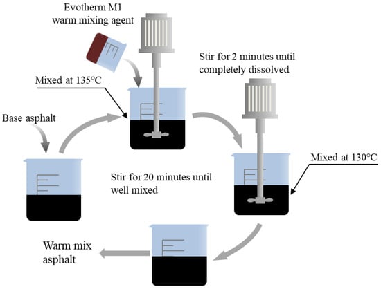 WMA was prepared as follows. First, the base asphalt was heated in an oven at 135 °C to a fluid state. Second, 500 g of base asphalt was weighed, to which the mass fractions of 0.5% and 1.0% Evotherm M1 were added and mixed evenly at low speed for 2 min with a mixer. Finally, the mixture was stirred for 20 min at 130 °C and 1200 r/min. Its preparation is shown in Figure 5. WMA was prepared from the neat #90 asphalt binder (graded based on the penetration value) and Evotherm M1. Its performance parameters are shown in Table 2. Base asphalt was provided by Gansu Province Transportation Planning, Survey & Designing Institute Co., Ltd. (Lanzhou, China). Evotherm M1 was provided by the Medvevik company, USA.
