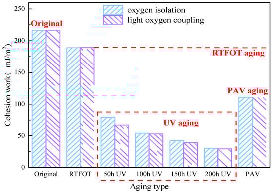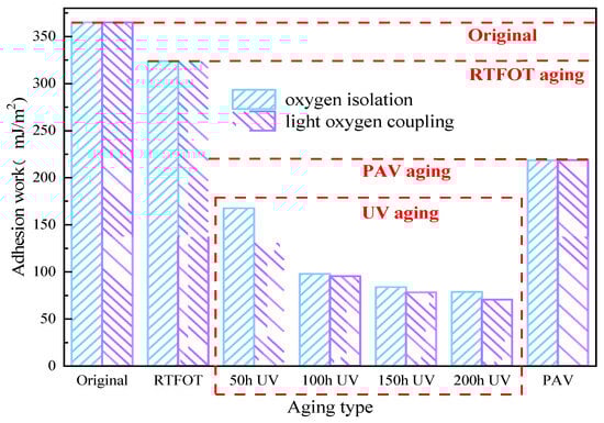It can be seen from Figure 6 that in RTFOT aging, PAV aging and UV aging, the adhesive work of WMA showed a decreasing trend. Compared with RTFOT and PAV aging, UV aging makes the WMA decline more obviously. It shows that UV aging and thermo-oxidative aging have different effects on WMA, and UV aging has a greater impact on WMA adhesive work. UV aging reduces the WMA adhesive work, and when the UV aging time exceeds 150 h, the decreasing trend gradually becomes stable. Under the light–oxygen coupling condition, the WMA adhesive work is smaller. This shows that the presence of oxygen aggravates the reduction in WMA adhesive work, which reduces the water damage resistance of WMA. This may be due to the light components in WMA being more likely to react with the presence of oxygen. As a result, the hard components in WMA increase, and WMA becomes hard, which further reduces the bonding performance of WMA.