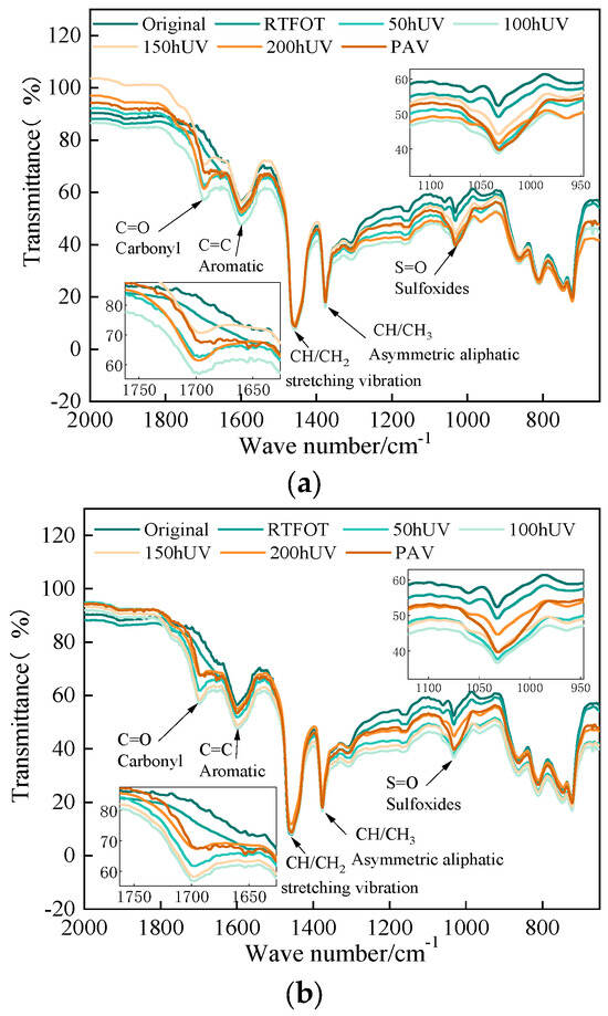 The carbonyl (C=O) absorption peak at 1700 cm−1 and the sulfoxide (S=O) stretching vibration peak at 1030 cm−1 of WMA increased significantly during oxygen barrier aging and light–oxygen-coupled UV aging. Comparing oxygen barrier aging and light–oxygen-coupled UV aging, it was found that the light–oxygen-coupled UV aging condition has a greater effect on these two absorption peaks than the oxygen barrier aging condition. The peak and area of the sulfoxide (S=O) functional group located at 1030 cm−1 increased slightly after short-term aging. However, after PAV aging and light–oxygen-coupled UV aging, the sulfoxide functional group changed significantly, indicating that a severe oxidation reaction occurred in the warm mix asphalt. FTIR spectrum of WMA is shown in Figure 8. The analysis of the causes showed that the sulfoxide group is a characteristic peak that characterizes the oxygen absorption aging of asphalt, and the increase in this peak indicates that the asphalt has undergone oxygen absorption aging. As a result, its properties will change significantly with the participation of oxygen. In addition, the change in functional groups after aging of PAV is comparable to the result of 50 h of UV aging, while the carbonyl peak of WMA stabilizes after 150 h of UV aging.