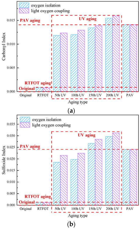 As can be seen in Figure 9, the carbonyl index gradually increases with aging time under oxygen barrier and light–oxygen conditions, indicating that warm mix asphalt undergoes a significant oxidation reaction under UV irradiation, and the degree of aging increases with UV aging time, gradual deepening. The trend of the carbonyl index of warm mix asphalt under light–oxygen-coupled UV aging is consistent with that under oxygen-isolating conditions, but the carbonyl index of warm mix asphalt under light–oxygen-coupled UV aging is significantly higher than that of warm mix asphalt under oxygen-isolating UV aging, indicating that there is the participation of oxygen, and the degree of aging of warm mix asphalt is more serious.