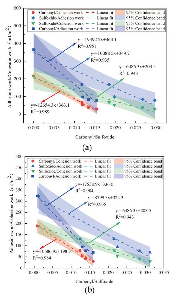 The figure shows the linear fitting relationship between the adhesive work and the roughness in the two environments. The correlation coefficients between surface roughness and adhesive work under light–oxygen coupling and single UV aging conditions are 0.9114 and 0.9067, respectively. All points fall within the 95% confidence band, indicating that the WMA roughness and adhesive work have an excellent fitting effect. In addition, under the action of light–oxygen coupling, the fitting points of adhesive work and roughness are relatively uniformly dispersed and closer to the fitting line [,]. While the fitting points are relatively aggregated under the action of the oxygen barrier and deviate from the fitting line, the Pearson index of the fitting curve under the action of light–oxygen coupling is larger, indicating a better fit.