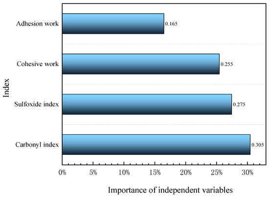 The adhesive performance evaluation parameters of WMA were optimized through RBF neural network model analysis. The results in Figure 12 indicate that the importance of adhesive work, cohesive work, sulfoxide index and carbonyl index is 0.165, 0.255, 0.275 and 0.305, respectively. The carbonyl index has the greatest impact on the adhesive performance of WMA during UV aging, followed by the sulfoxide index and adhesive work, with adhesive work having the lowest importance. In addition, based on the contribution rate in Table 6 and the importance index in Figure 12, this article calculates the contribution rate of ultraviolet and oxygen to the aging degree of WMA during the UV aging process according to Equations (14) and (15), as shown in Figure 13.