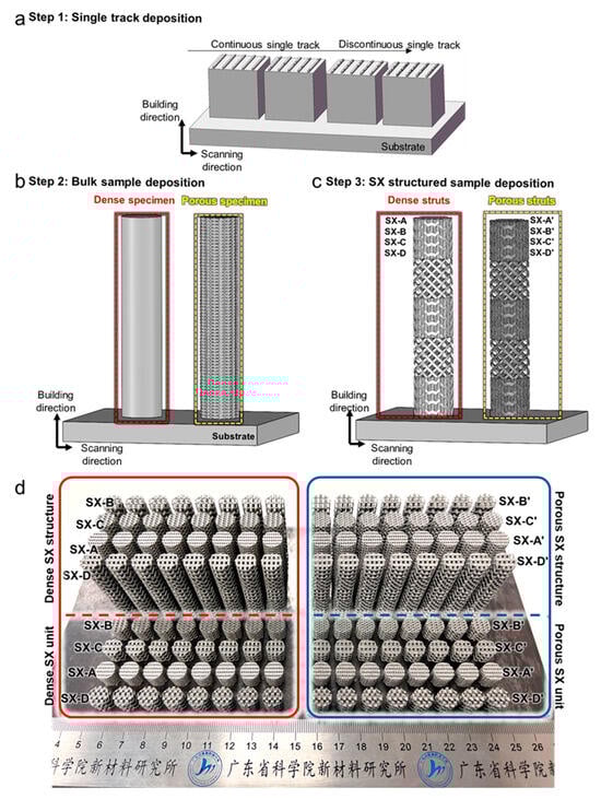 | SX-structured deposition | Power: 280 W Scanning speed: 950 mm/s Hatch distance: 0.11 mm Layer thickness: 40 μm | Power: 120 W Scanning speed: 800 mm/s Hatch distance: 0.21 mm Layer thickness: 40 μm |