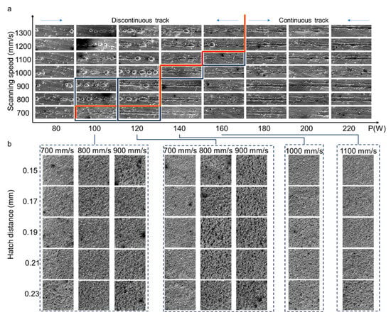 | Single-track deposition | / | Power: 80–220 W Scanning speed: 700–1300 mm/s |