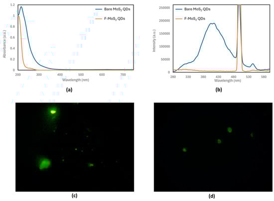 (a) UV–Vis spectra, (b) fluorescence spectra, and fluorescence microscopy images: (c) green emission of bare MoS2 QDs and (d) F-MoS2 QDs.