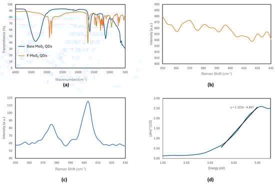 In contrast, the Raman spectra for the bare MoS2 QDs (Figure 2b) lack resolvable peaks compared to the bulk MoS2 spectra (Figure 2c), which exhibit characteristic Raman peaks. As such, the Raman spectra of the F-MoS2 QDs do not have any present E12g or A1g peaks (Figure 2b). This observation is consistent with results from Qiao et al., who reported weakened Raman signals in MoS2 QDs produced via a multi-step lithium intercalation process []. The reduced Raman signals in the F-MoS2 QDs can be attributed to multiple factors, including structural defects and charge transfer effects. The reduction in the Raman signal intensity may be due to the signals of the Raman-active bands falling below the resolution of the spectrometer used in this study, which had lower-magnification objective lenses compared to those in other studies [].